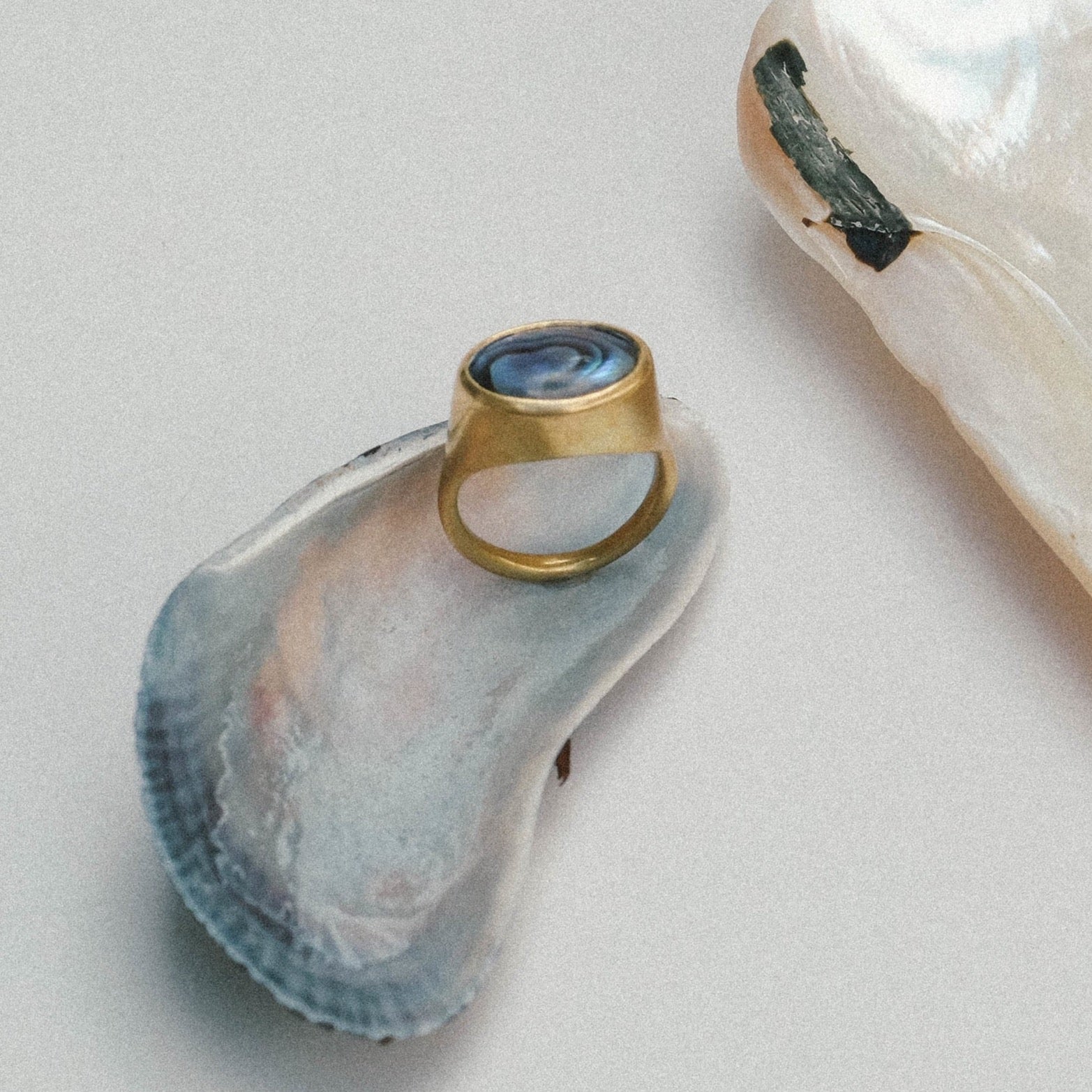 天然のアバロン貝(孔雀貝)を施したリング。ブランドのポーチが付いています。