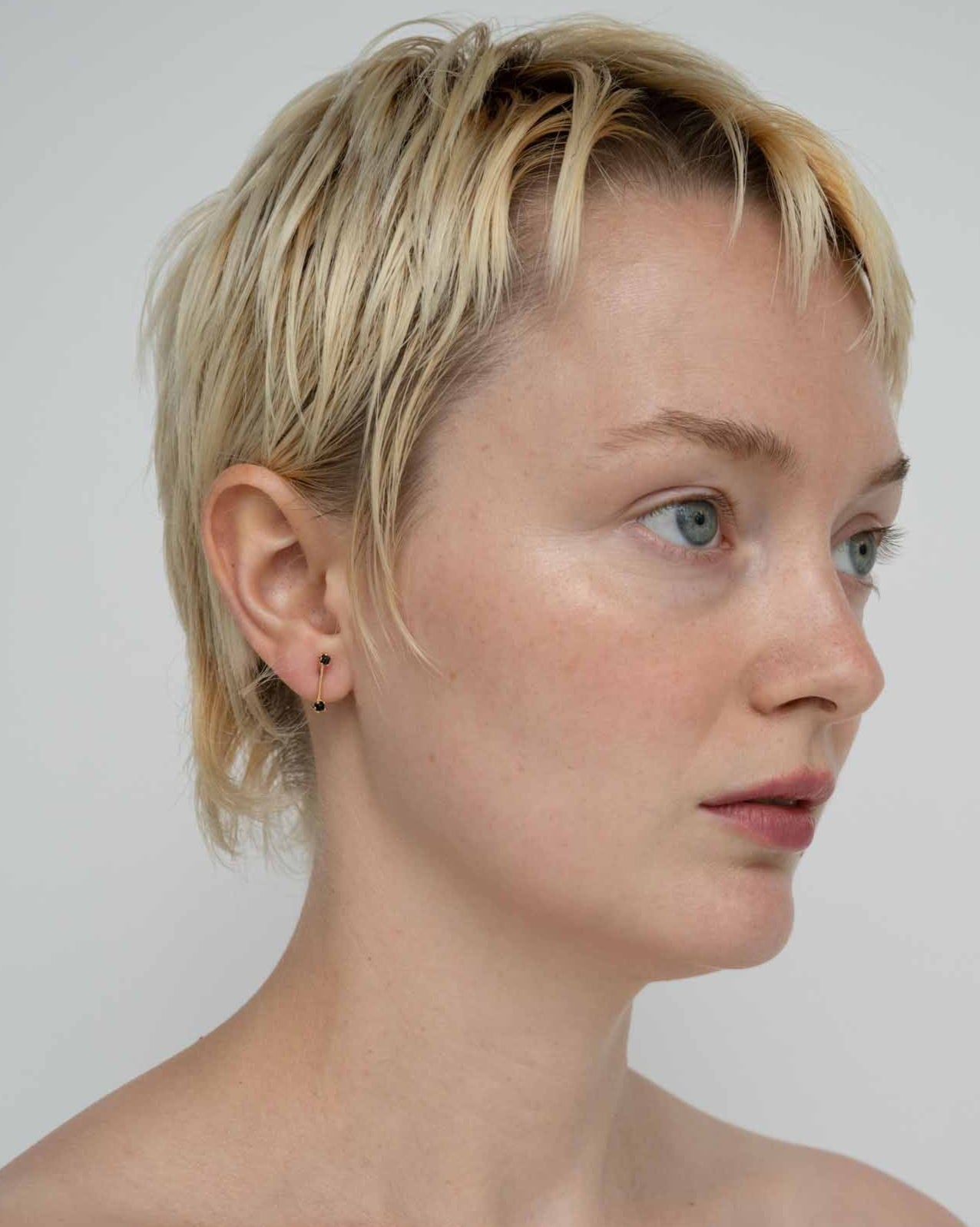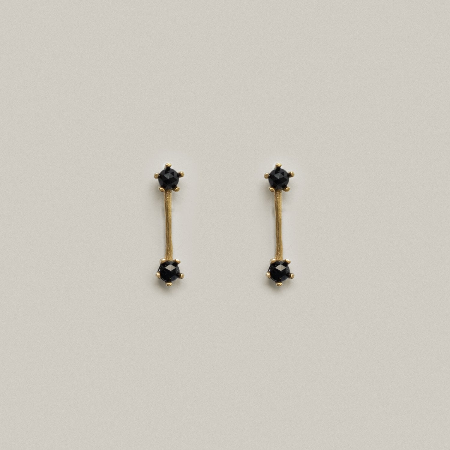棒状のモチーフに、二粒のオニキスをあしらったピアス。