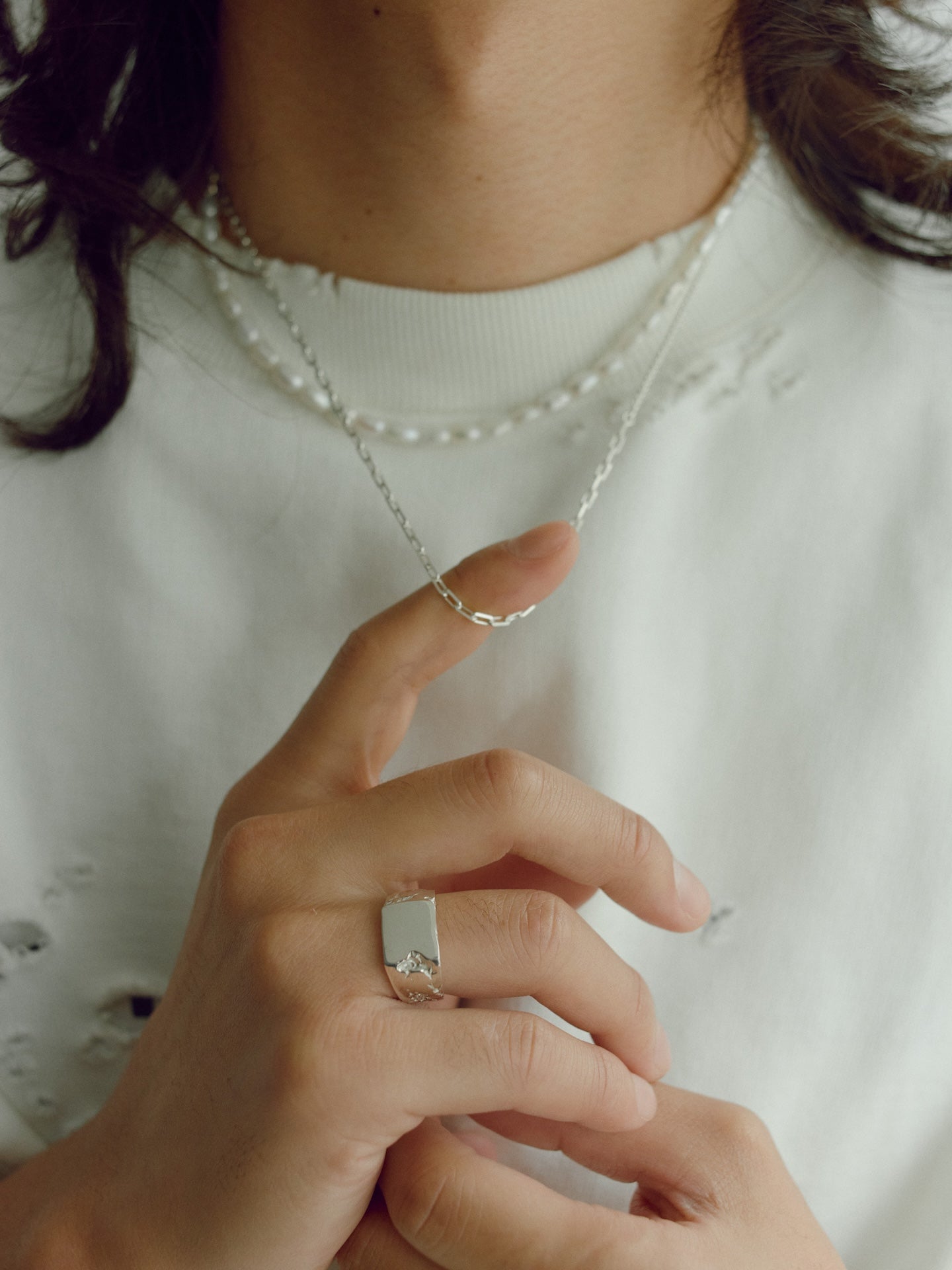 リングの場合は、市販のシルバー磨きクロスで磨いていただくと元どおりになります。ネックレスなどの細かいチェーンのケアにはシルバー磨き液体がおすすめです。仕上げにシルバー磨きクリームを使用すると綺麗な状態を保っていただけます。