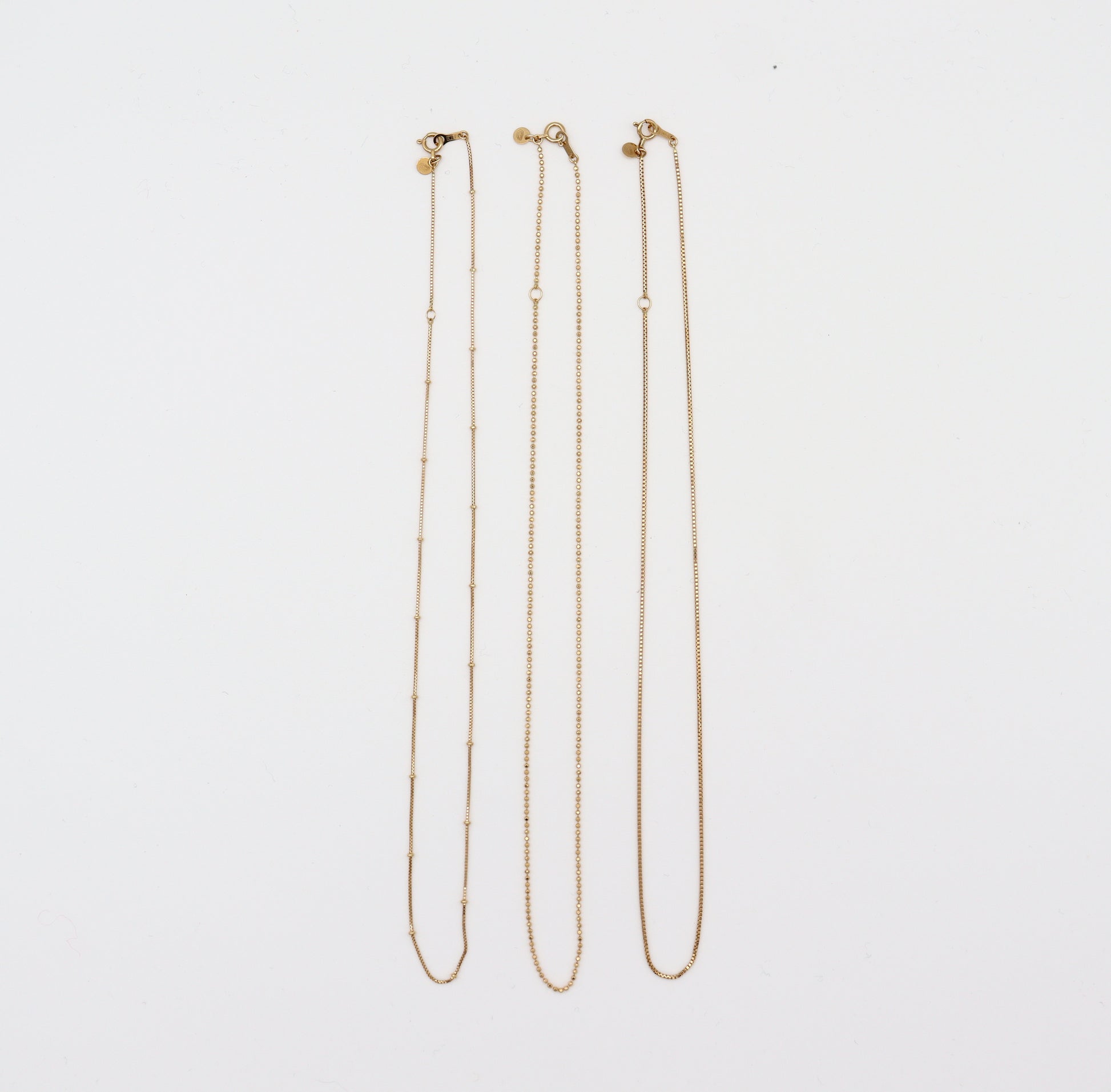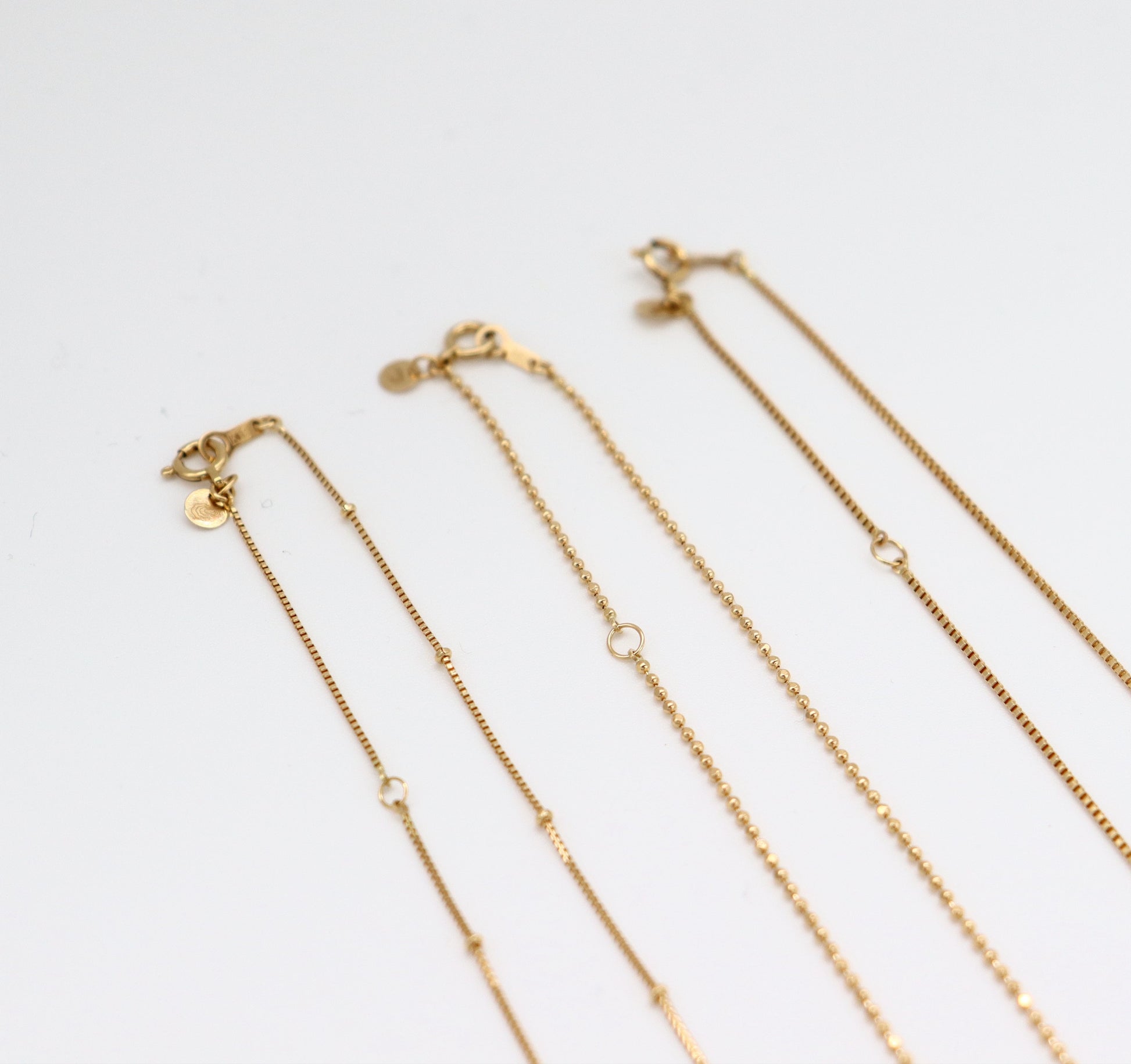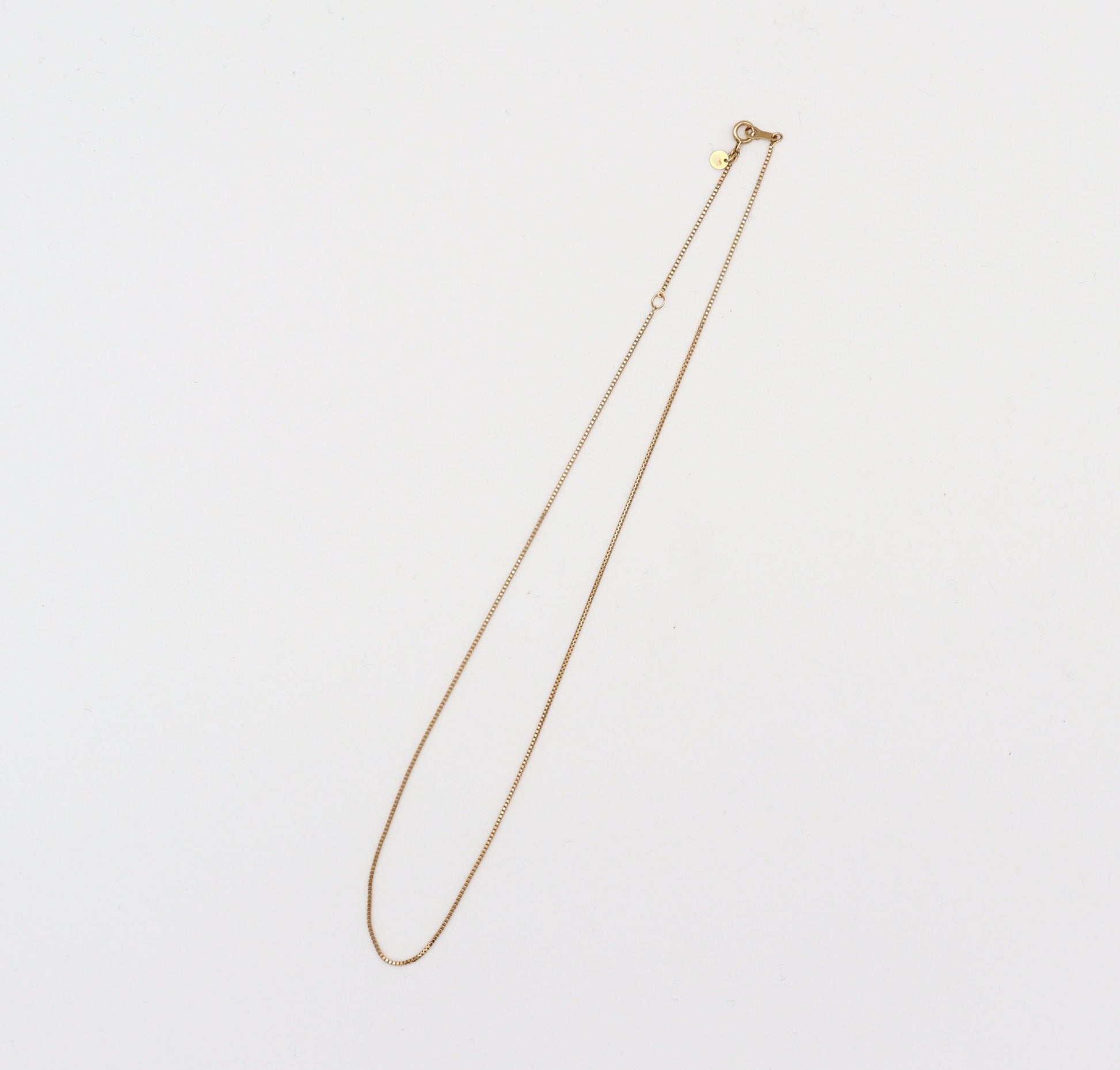 PAULINE STUDIOオリジナル、18金のボックスチェーンネックレス。角度によってツヤのある輝きを放ちます。37cmと40cmの長さ調節が可能で、他のネックレスとの重ね付けもオススメです。
