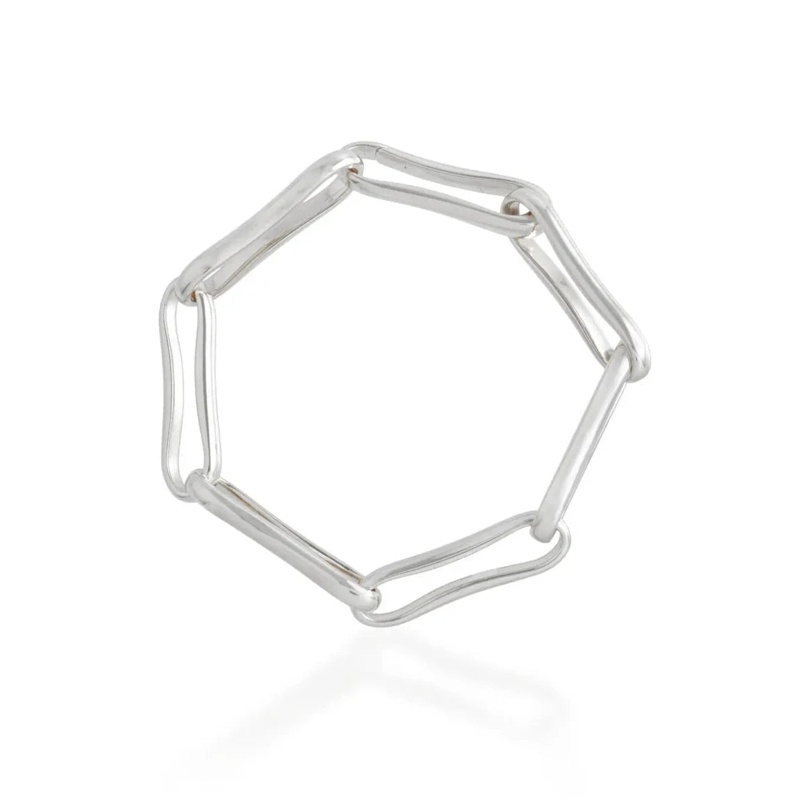 ミニマルで大胆なチェーンブレスレット。ロックをチェーンのデザインの中に隠し、洗練された印象に仕上げています。