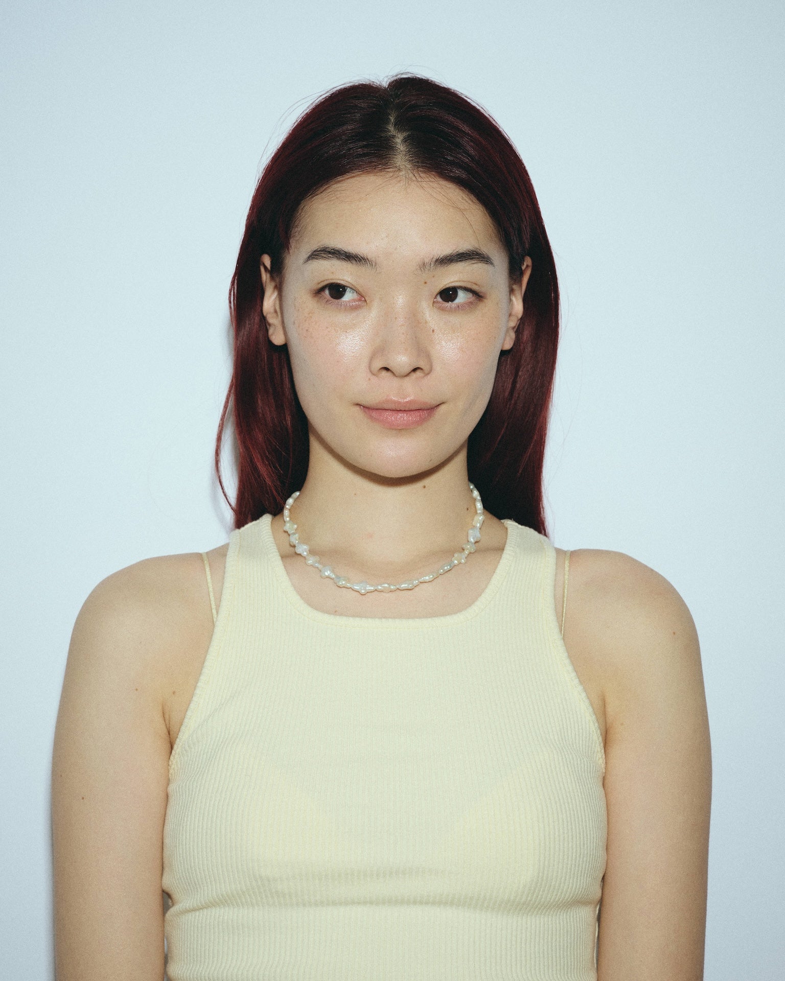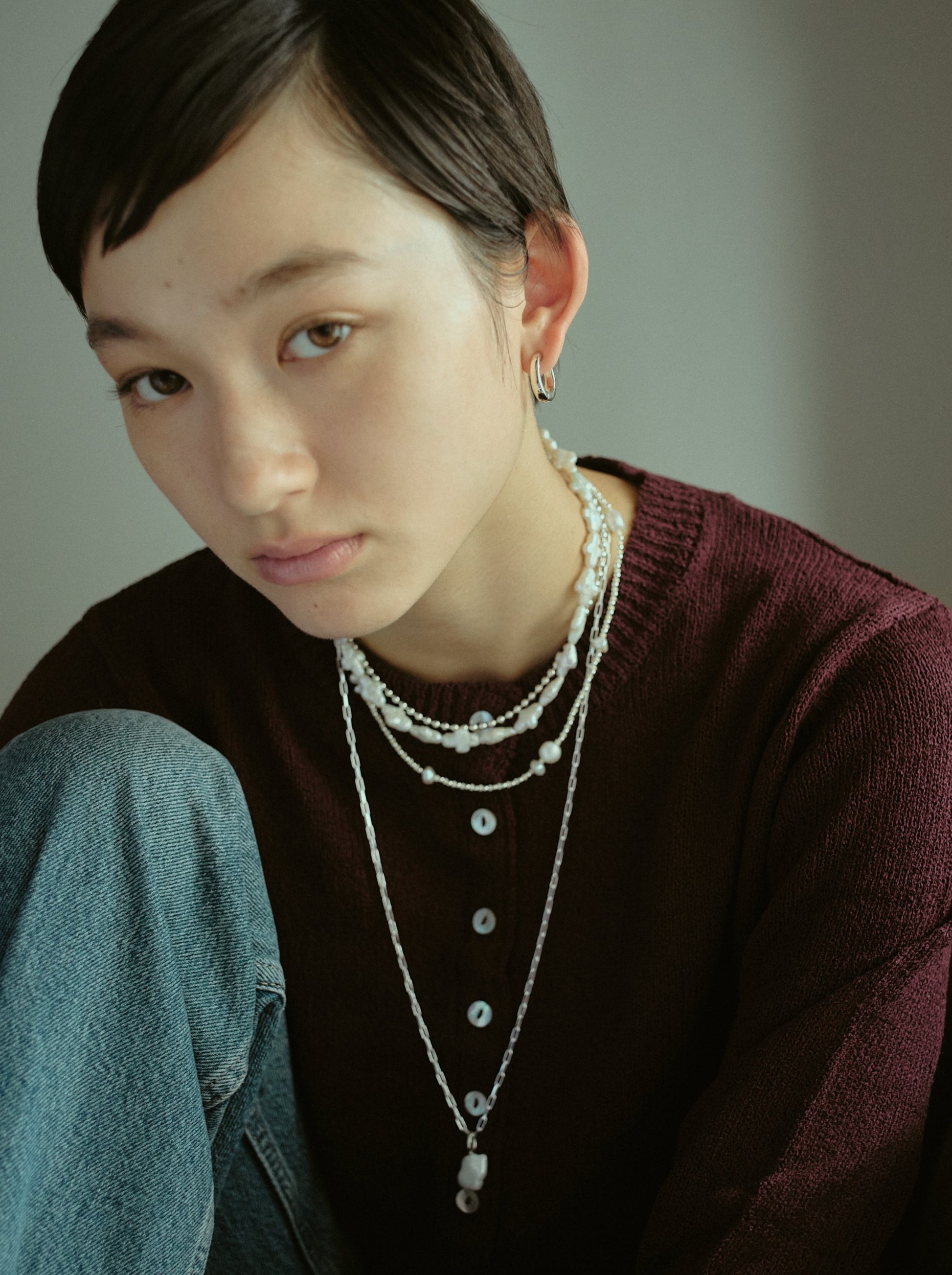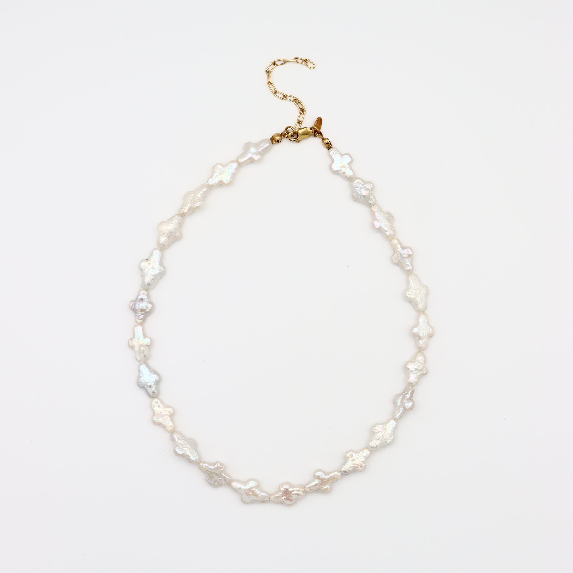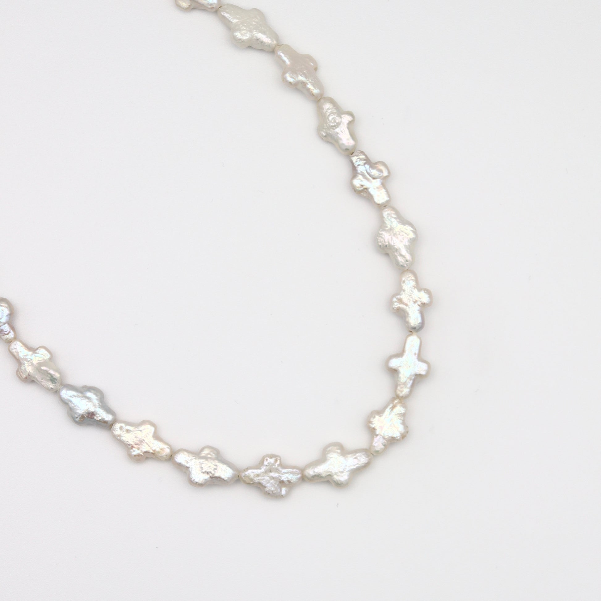 養殖の貝にクロス型の核を入れることで、クロス型の淡水パールに仕上げました。それらを贅沢に使用したネックレスは、アジャスター部分のチェーンのデザインにもこだわりました。