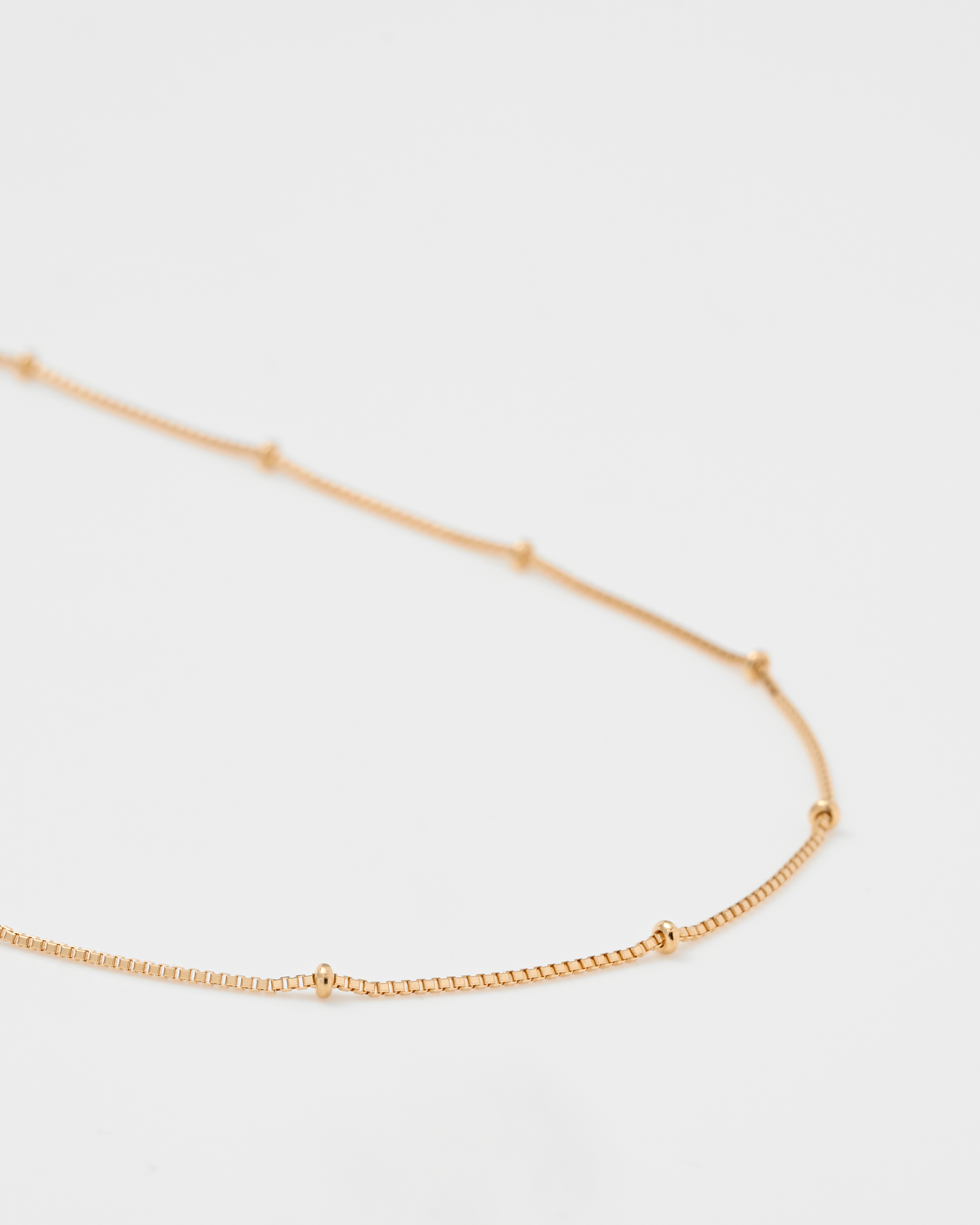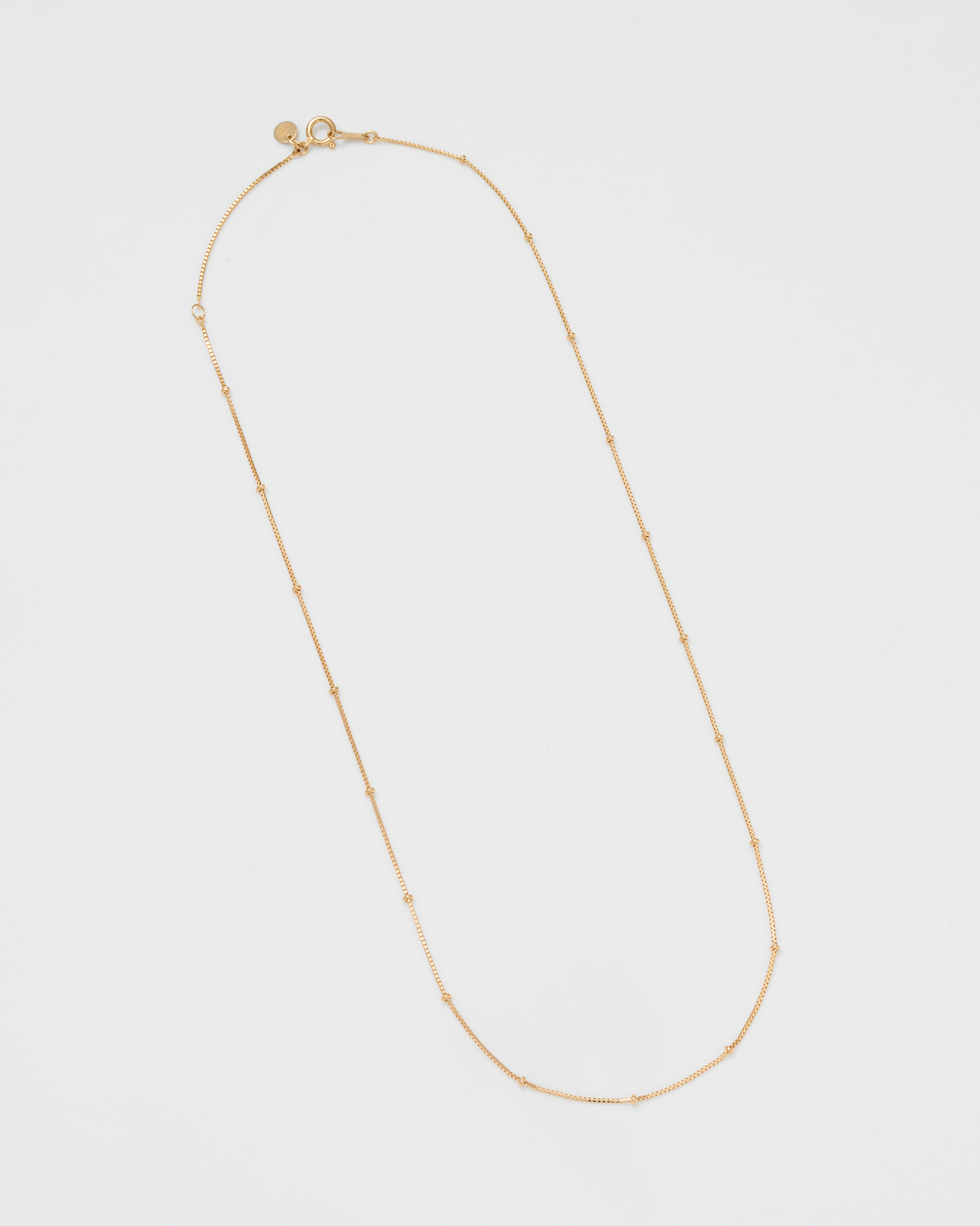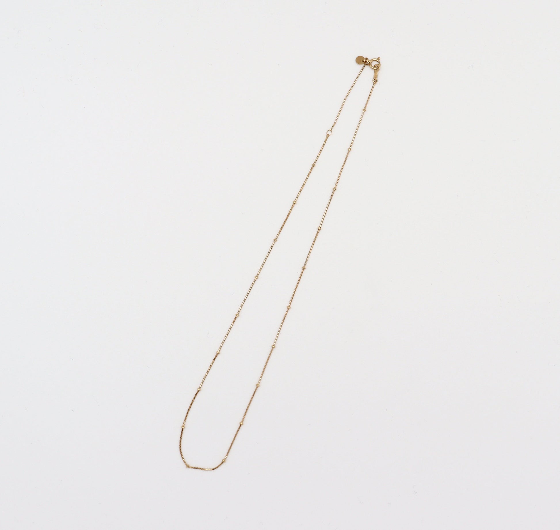 18金のチェーンネックレス。艶のあるボックスチェーンに、小さなボールのデザインを施しました。37cmと40cmの長さ調節が可能で、他のネックレスとの重ね付けもオススメです。