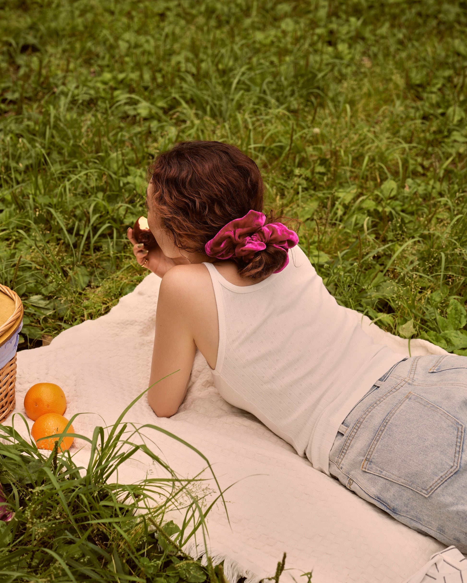 高級感のあるベロア生地を贅沢に使用したオーバーサイズのシュシュ。しっかり留まり強度面も安心です。goldのブランドタグが付いています。