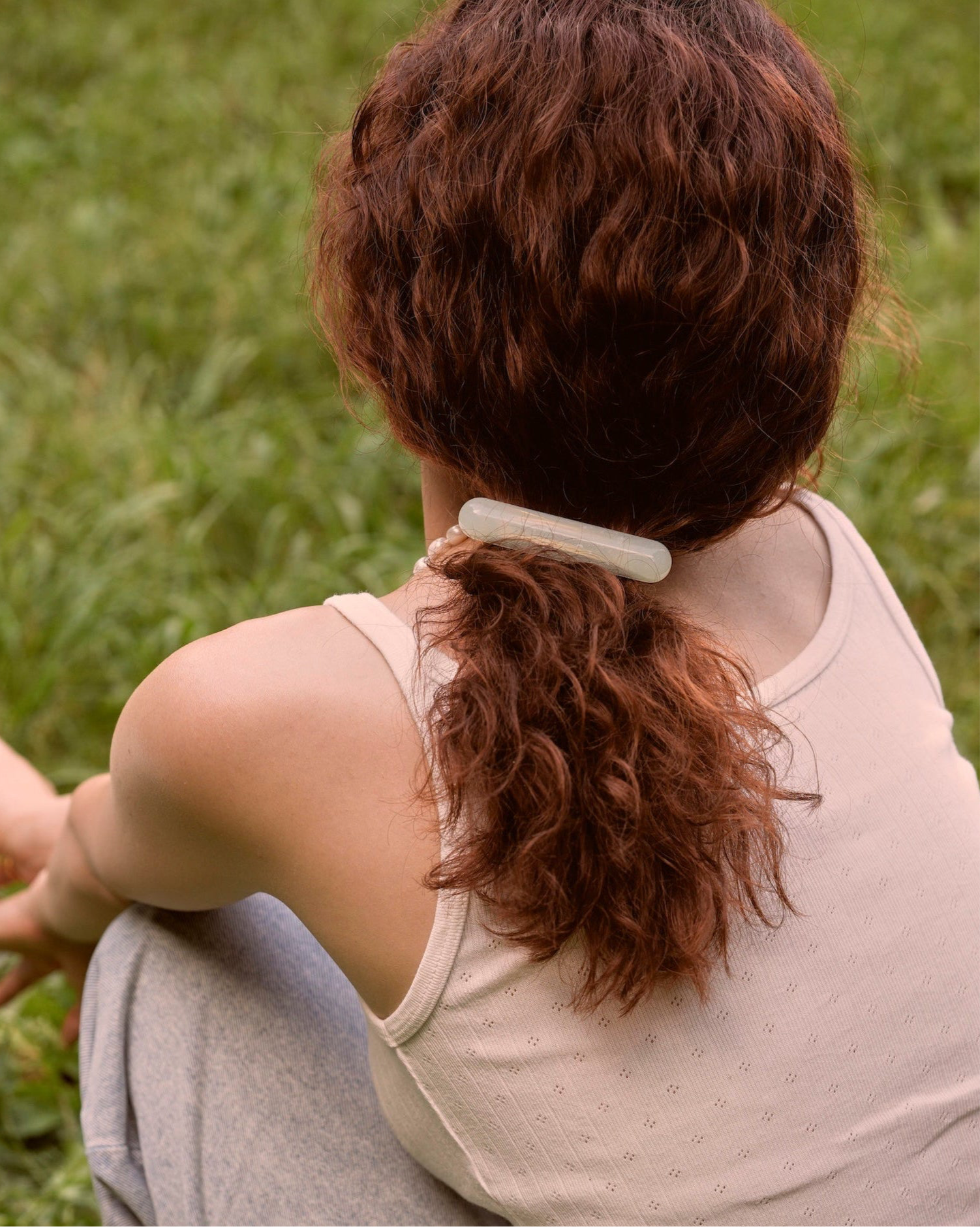 手作業でつくられたマーブル柄、ぷっくりとしたフォルムが魅力のバレッタ。天然石のJade(翡翠)をイメージしたカラー。カジュアルなコーディネートにもオケージョンシーンにもおすすめです。
