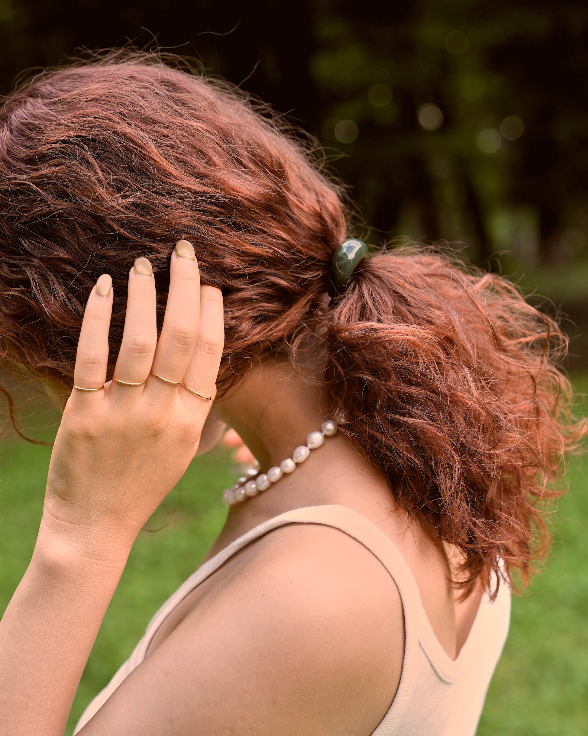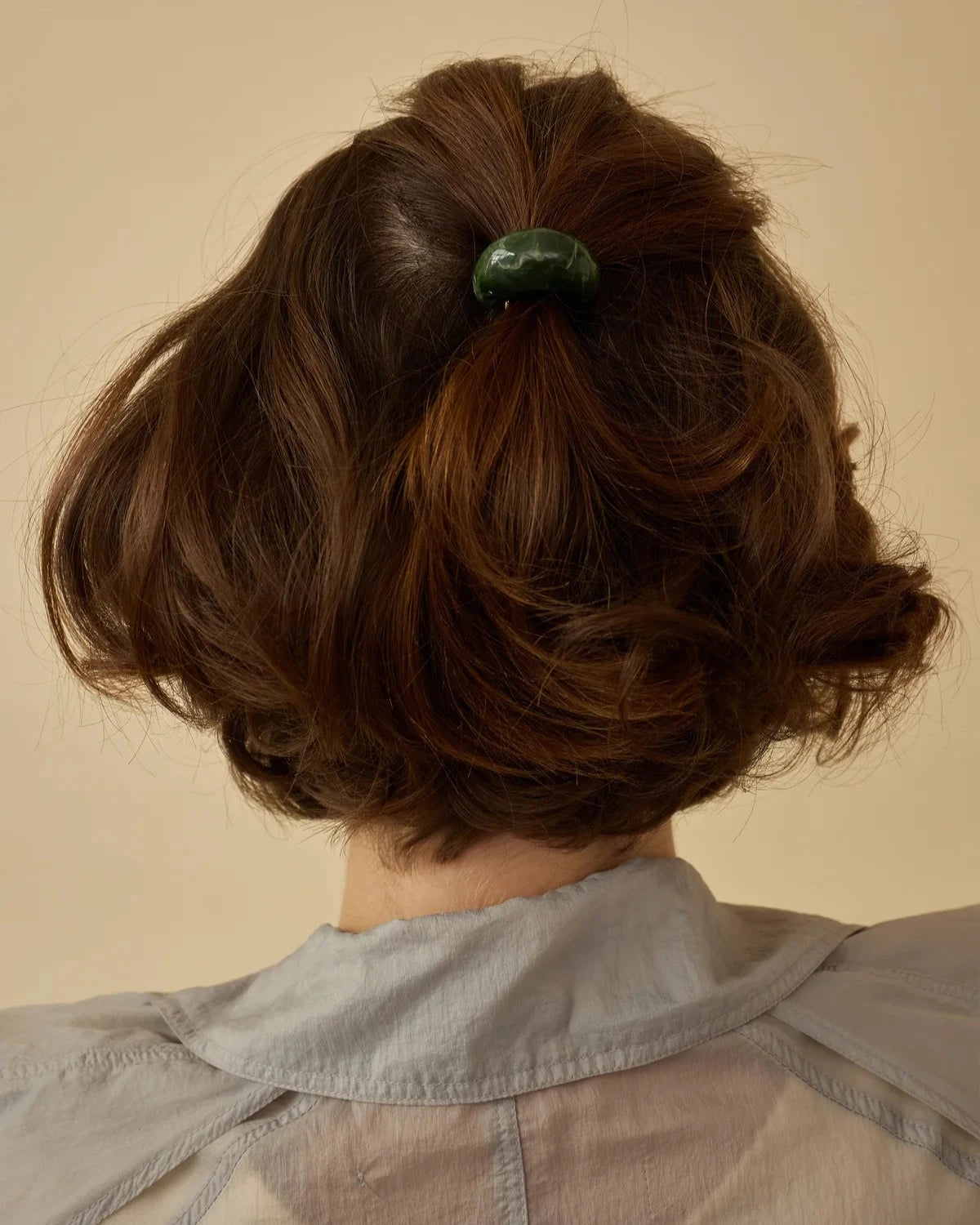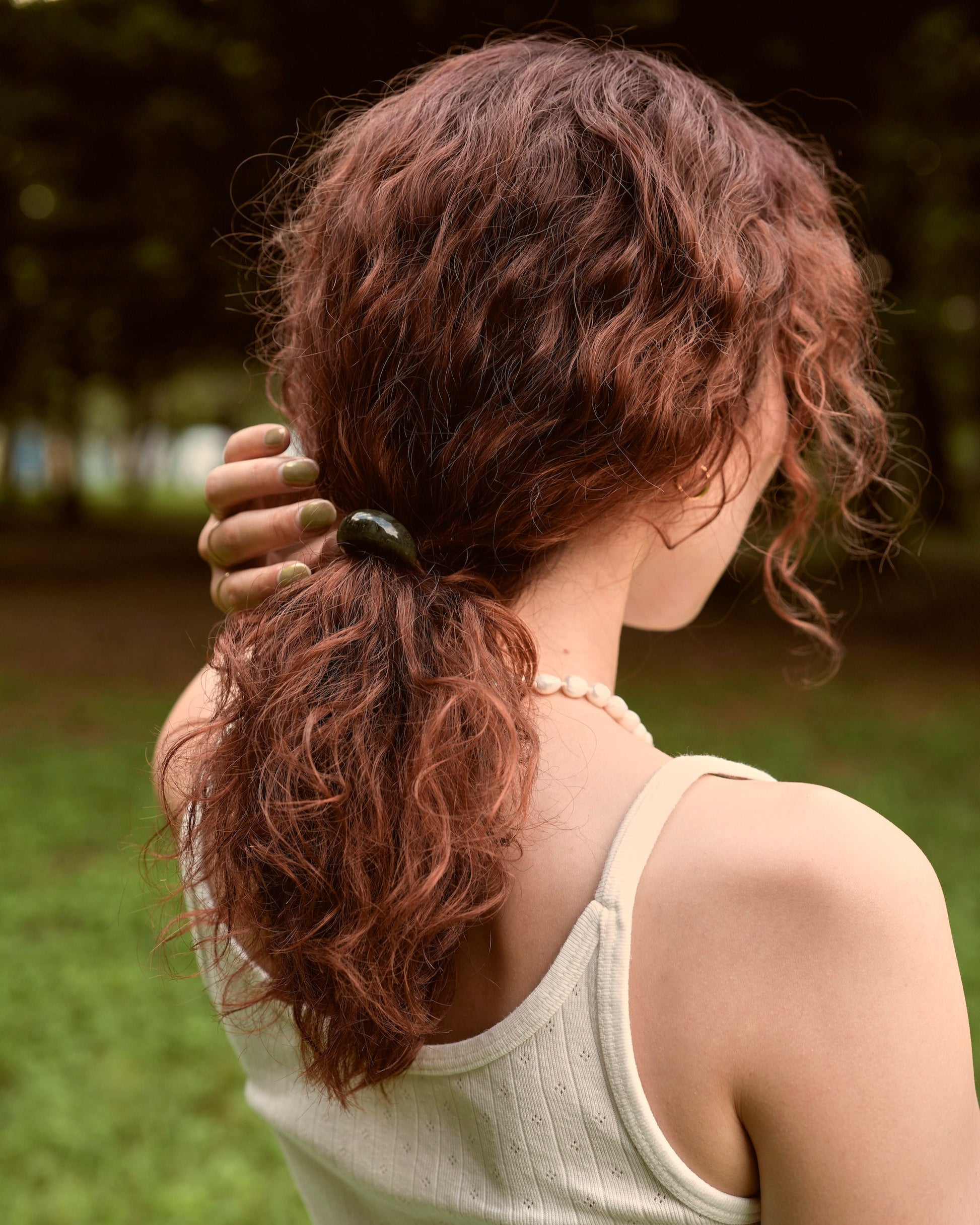 手作業でつくられたマーブル柄、ぷっくりとしたフォルムが魅力のポニーカフ。天然石のMalachite(孔雀石)をイメージしたカラー。ヘアゴム部分が非常に小さく、三つ編みの一番最後や、他のヘアゴムでつくったポニーテイルの上からつけたりするのに最適。ボブやショートの方のハーフアップも◎