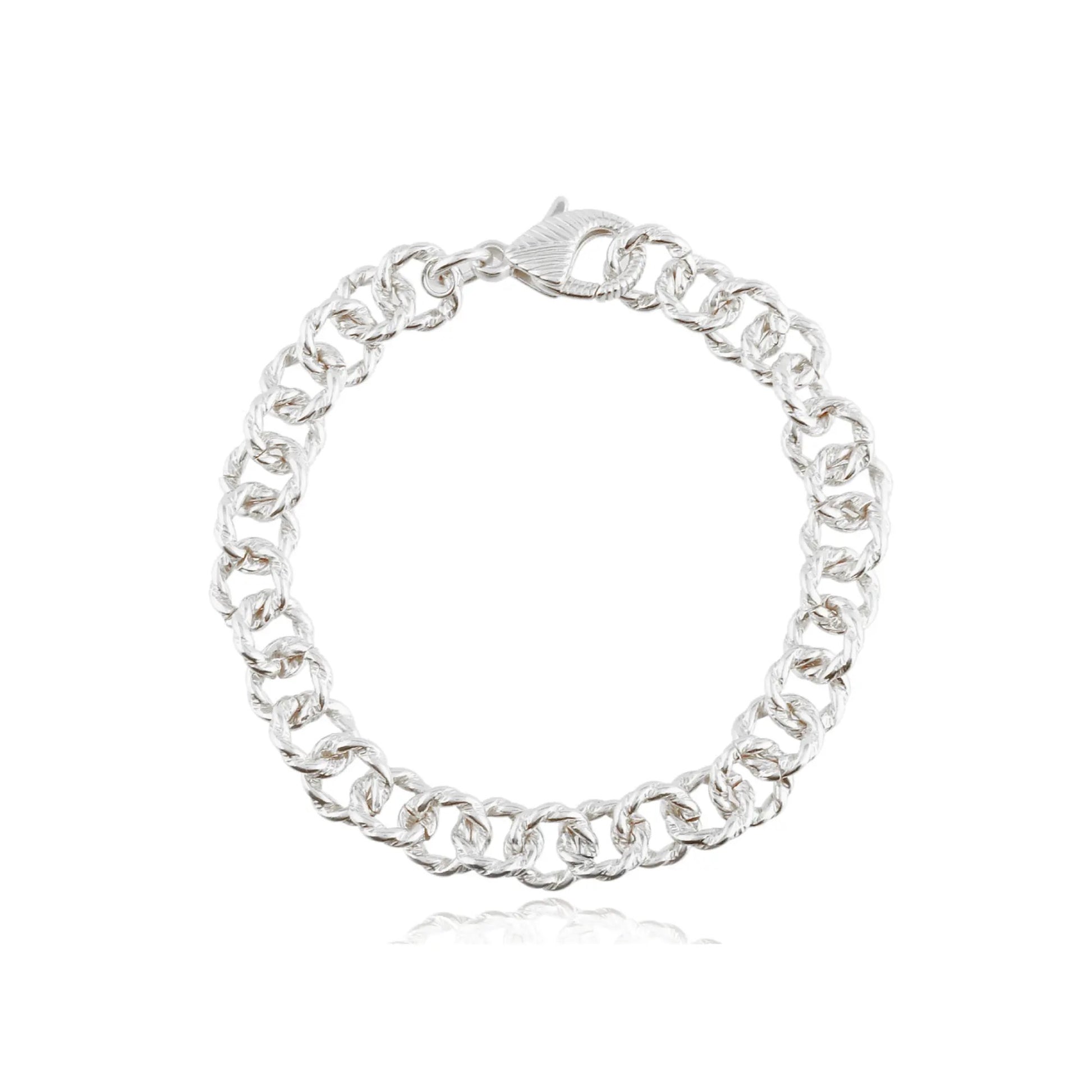 鎖のように交互に連なったチャンキーなチェーンブレスレット。ハンドハンマーで柄をつけてあり、存在感がありながらもエレガントさを兼ね備えた一点です。