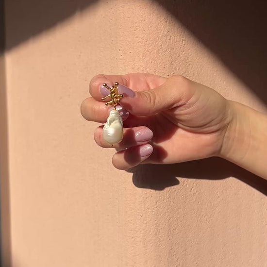 ゴールドのスパイクのようなトップに、天然のパールをあしらったピアス。パールの自然なフォルムが魅力です。