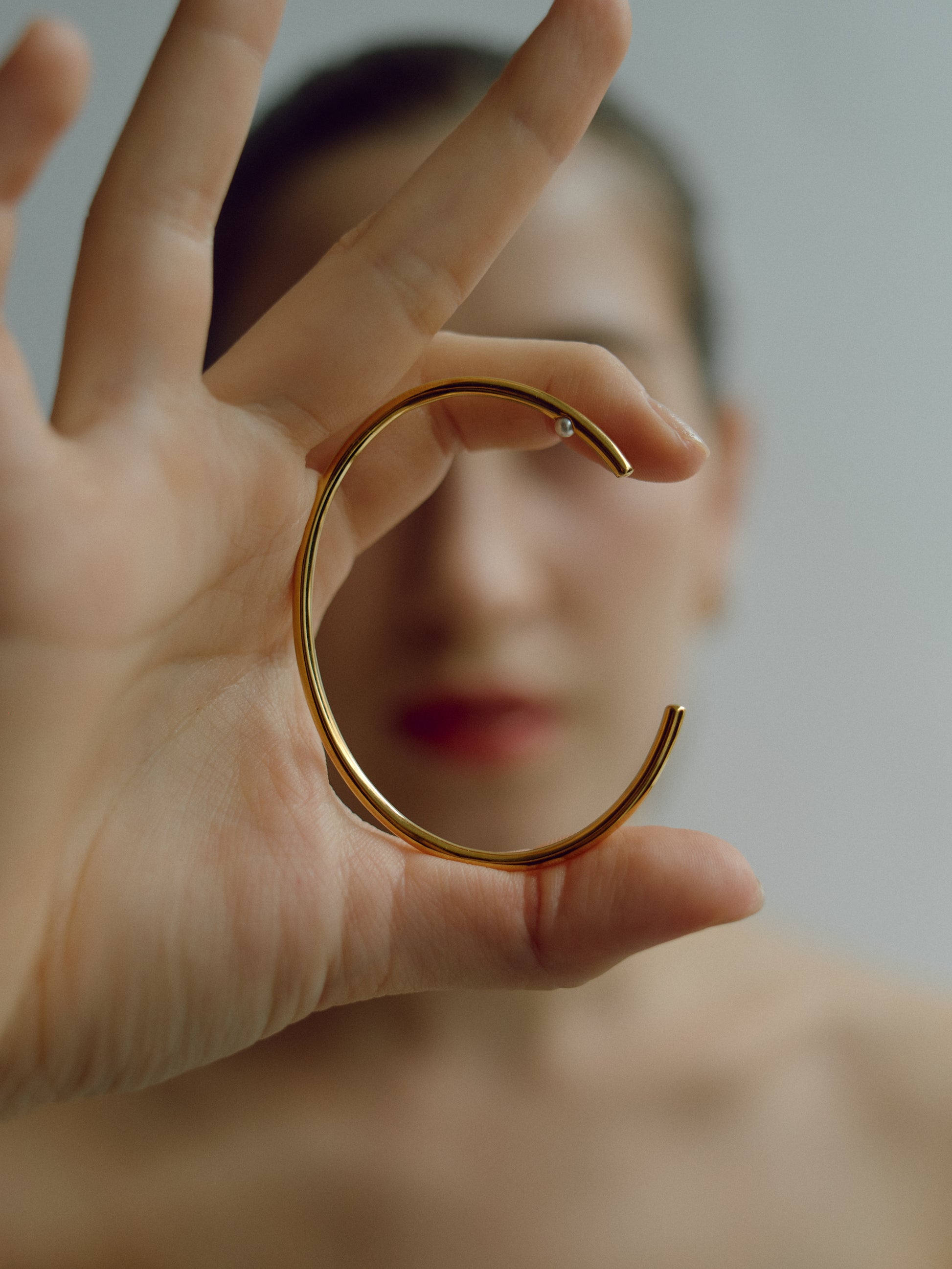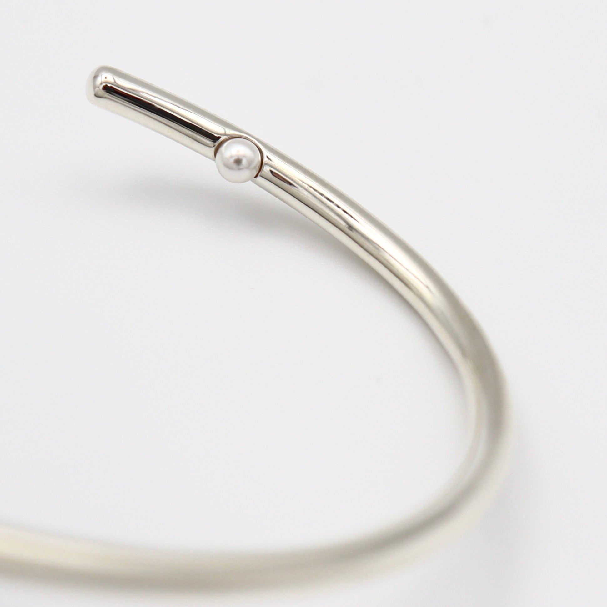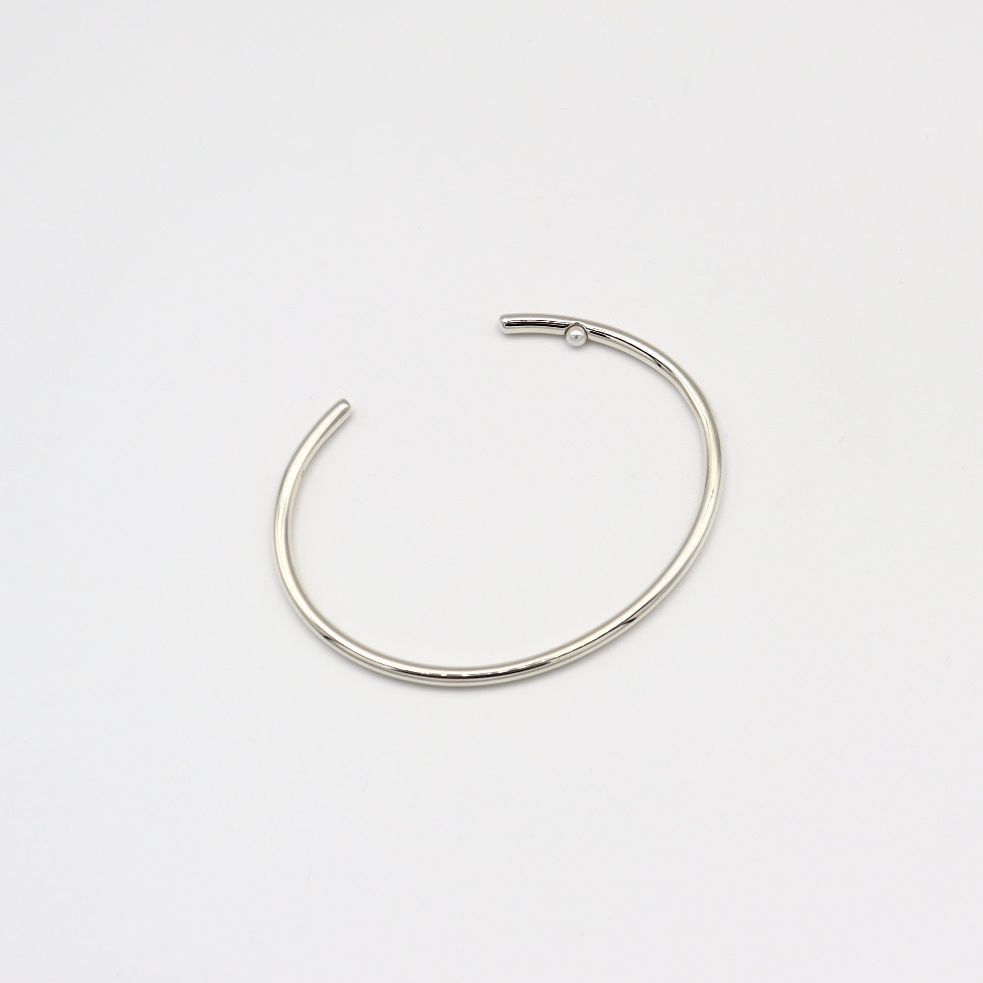 内側に一粒パールをあしらったシンプルなバングルです。Silver925製なので重厚感があり、ミニマルなデザインだからこそ、洗練されたディテールと素材の上質さが光ります。