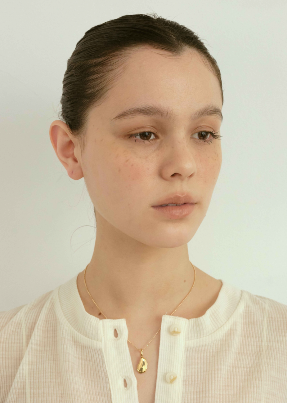 オイスターデザインのペンダントトップ。チェーンを通す部分の丸パーツがデザインポイントとなっているとともに、あらゆるサイズのチェーンが通せます。パールネックレスにに通すのもオススメです。