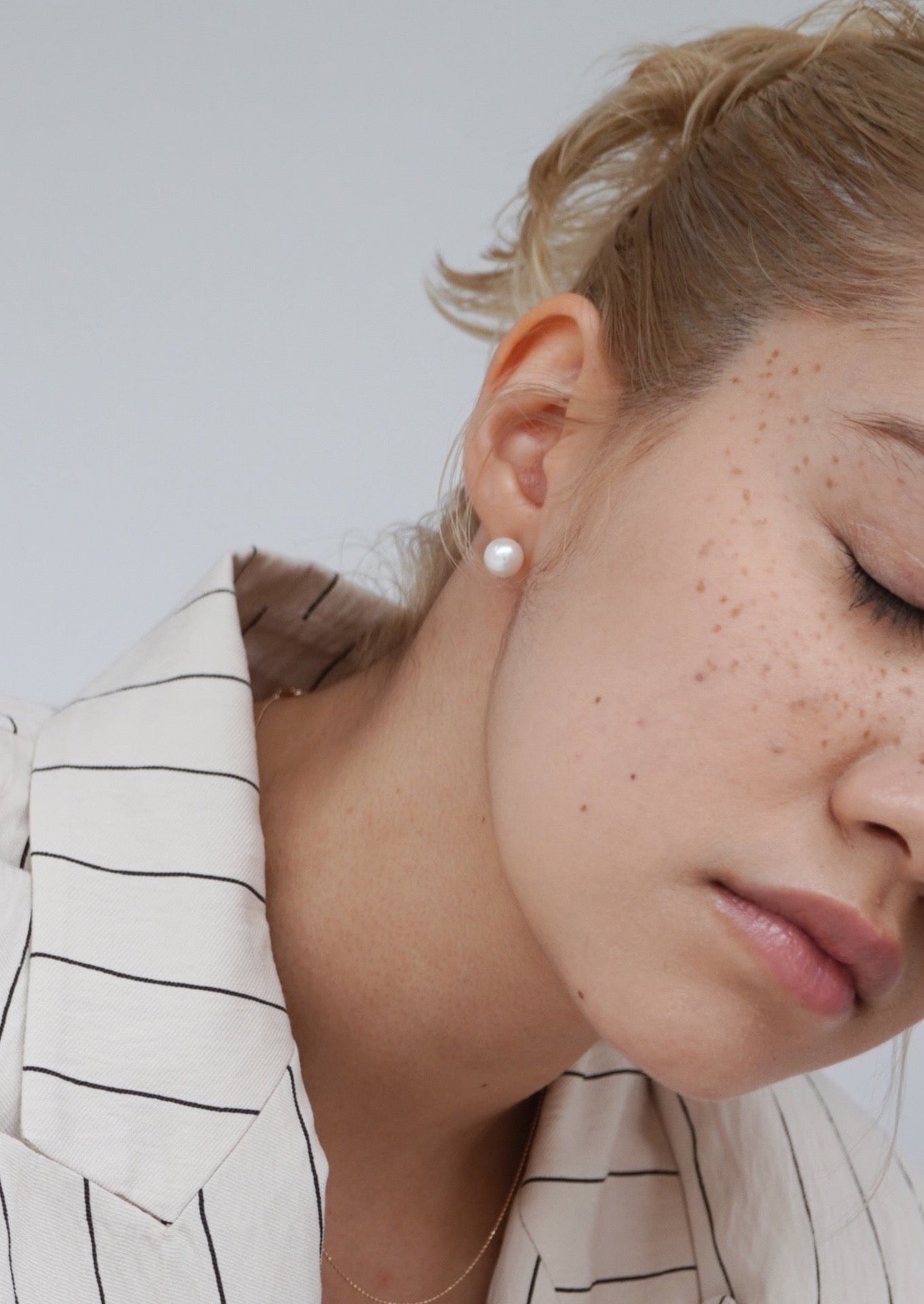 8mmガラスパールのスタッズピアス。イミテーションパールの中でも本物のパールに輝きが近いガラスパールは、汗や皮脂にも強く、日常使いにおすすめです。