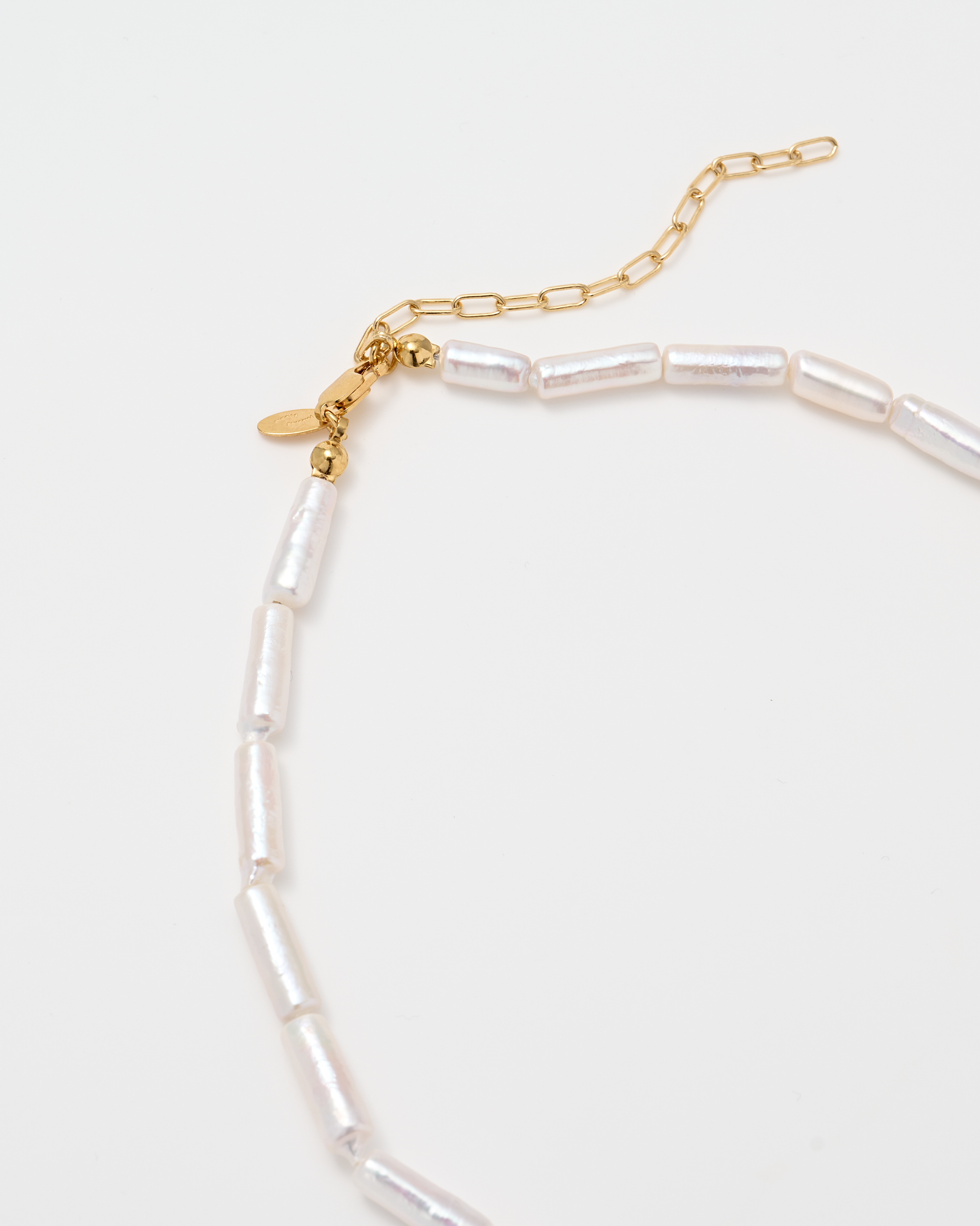 細長いスティック状の淡水パールネックレス。アジャスター部分のチェーンのデザインにもこだわりました。 PAULINE STUDIOのオイスターマークのブランドタグが付いています。