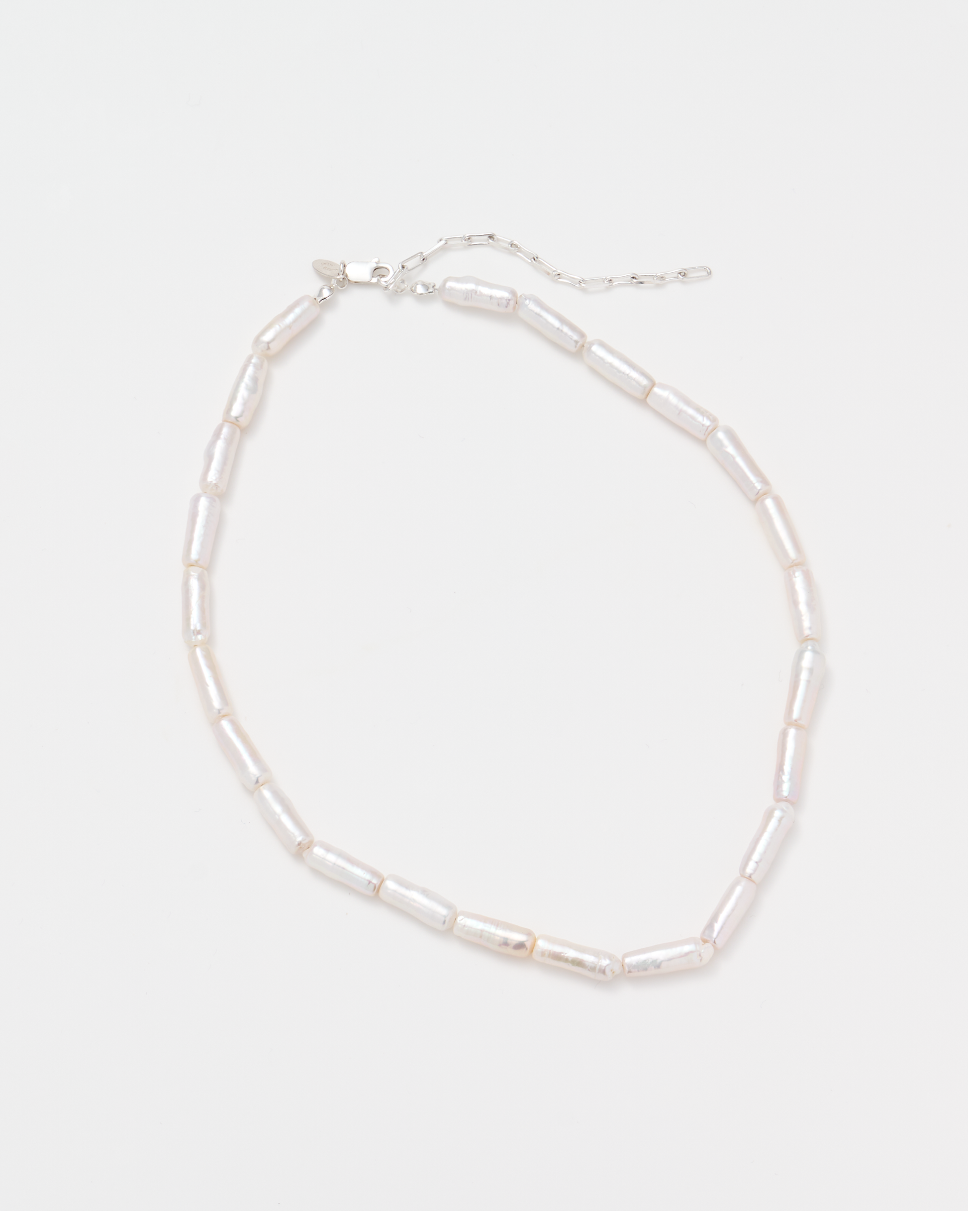 細長いスティック状の淡水パールネックレス。アジャスター部分のチェーンのデザインにもこだわりました。 PAULINE STUDIOのオイスターマークのブランドタグが付いています。