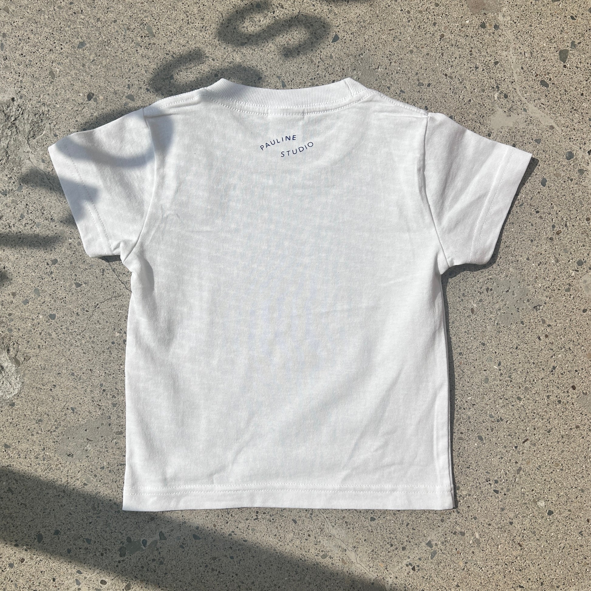 PAULINE STUDIO初となるオリジナルTシャツ。ボディのTシャツはドライでザックリとした風合い。上質なオープンエンド糸を使用する事によって生み出されるタフなボリューム感と、二本針縫製で一手間加えたリブがポイントです。バックの首元にはロゴプリントを施しています。