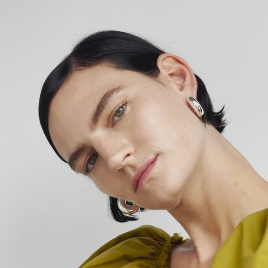 JENNYBIRDのアイコンデザイン、Tome HoopsのLサイズ。オリジナルのボールデザインキャッチによって、横姿や後姿も素敵です。ブランドのオリジナルボックスに入れてお届けいたします。