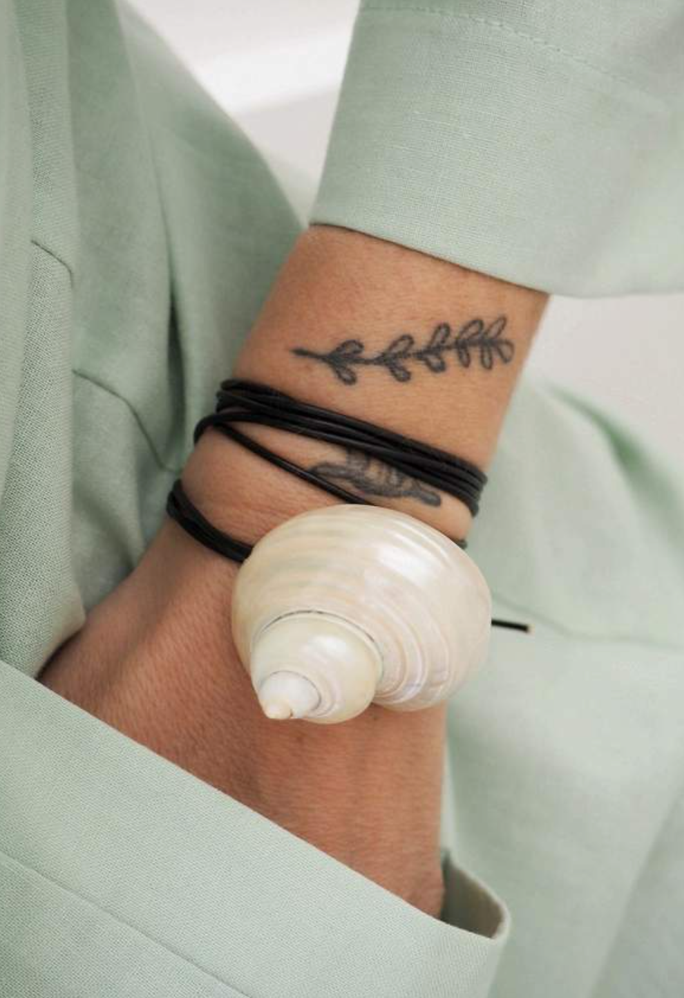 レザーの紐に天然の貝を通したチョーカー。ブレスレットとしてもご着用いただけます。ブランドのオリジナルボックスに入れてお届けいたします。