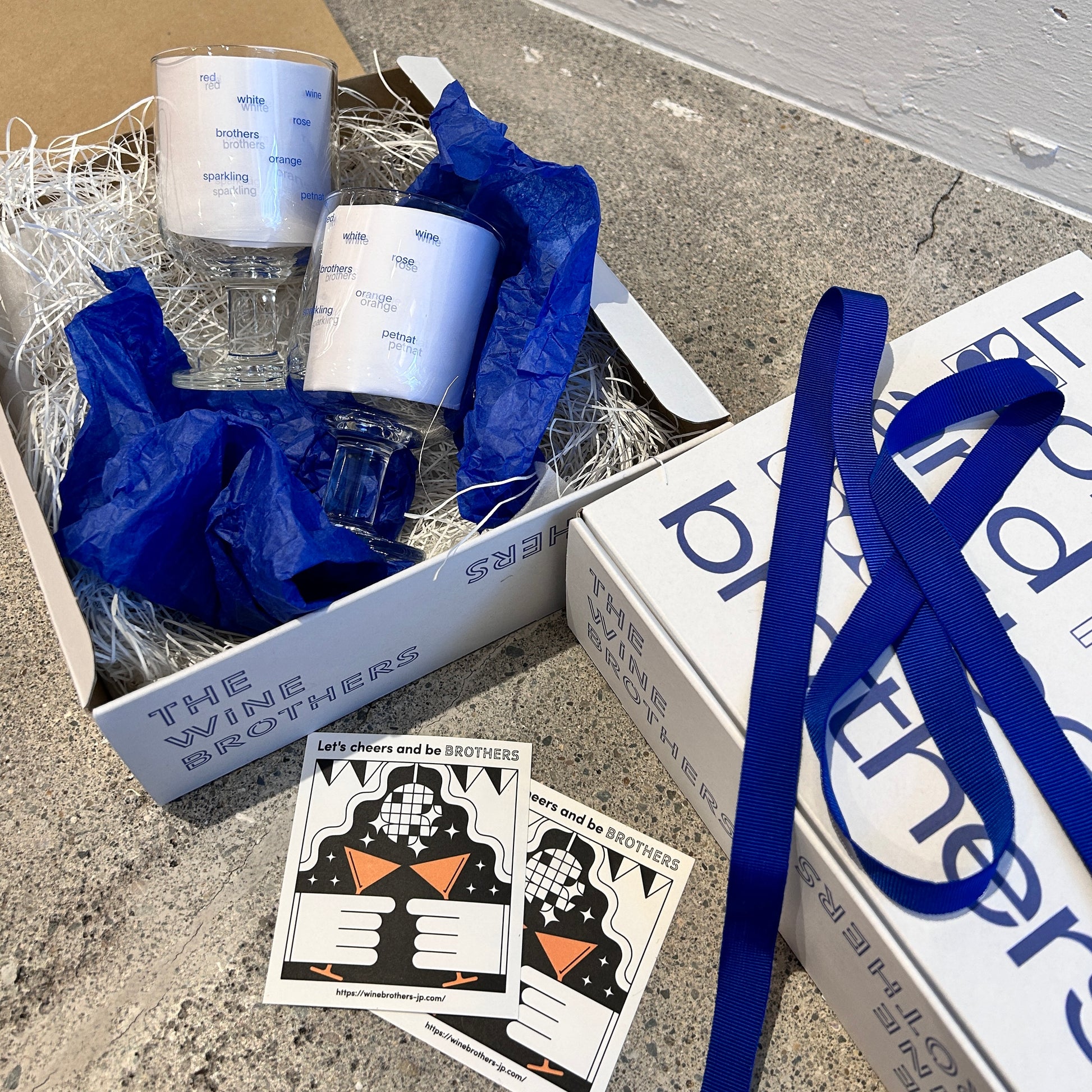 WINE BROTHERSオリジナルデザインのグラス2脚を、オリジナルのギフトボックスに入れたスペシャルなセット。